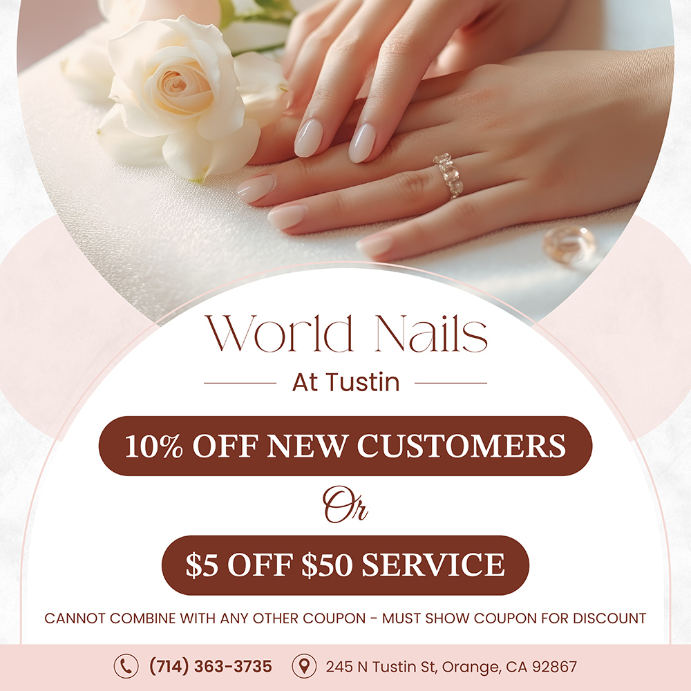 Welcome to World Nails At Tustin. Located at a beautiful place in Orange, CA 92867. World Nails At Tustin offers the ultimate in pampering and restoring your beauty with our whole-hearted, careful & professional staff. Comprehending customer is not an easy task. It’s even harder when it comes to nail art & caring services.